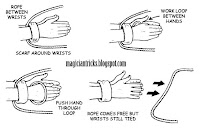 Secret: Ask someone to tie your wrists together with a large scarf. A long length of soft rope is now placed between your wrists and someone holds the ends. Another scarf is thrown over your bound wrists. As soon as your hands are out of sight move your hands back and forth to cause the rope to form a loop between your wrists. Keep working the rope until you can get one hand into the loop. When you have done this ask the person who is holding the rope to pull – the rope will come free and yet your wrists are still securely tied!